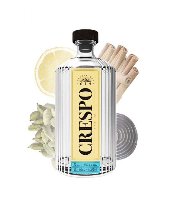 Le Crespo London Dry Gin est la base parfaite pour un gin tonic. Il est élaboré selon la méthode traditionnelle, en triple distillation et en utilisant parmi ses ingrédients : genièvre, coriandre, écorces de citron et d’orange, cannelle douce, réglisse, racines d’Angélique et de Florence, écorce de Cassia, aneth, cardomome et eau pure d’El Cajas, des Andes équatoriennes.