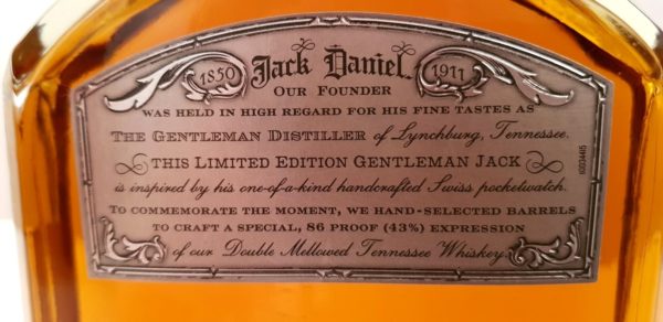 La bouteille est un format unique d’un litre qui reprend une plaque métallique spécifique, inspirée de la montre à gousset ayant appartenu à Jack Daniel. Une montre élaborée par la maison horlogère suisse Patek Philippe, qui confirme la goût du « Gentleman Distiller » pour l’artisanat et le savoir-faire.