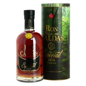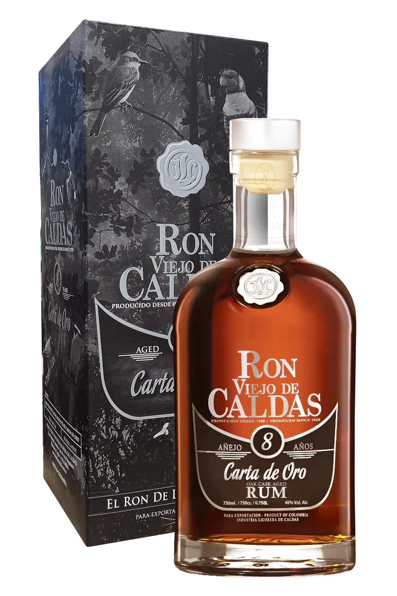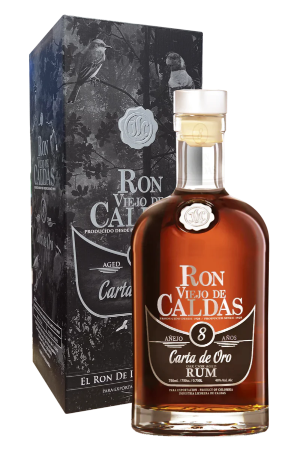 RON VIEJO de CALDAS 8 Ans Carta de Oro . Ce Rhum ambré de Colombie est très populaire en Amérique du sud, c’est un rhum de canne à sucre, il est vieilli 8 ans dans la Cordillère des Andes, à plus de 2200 mètres d’altitude dans des fûts de chêne blanc issu des forêts environnantes.